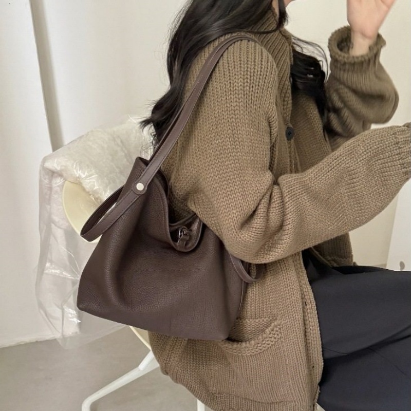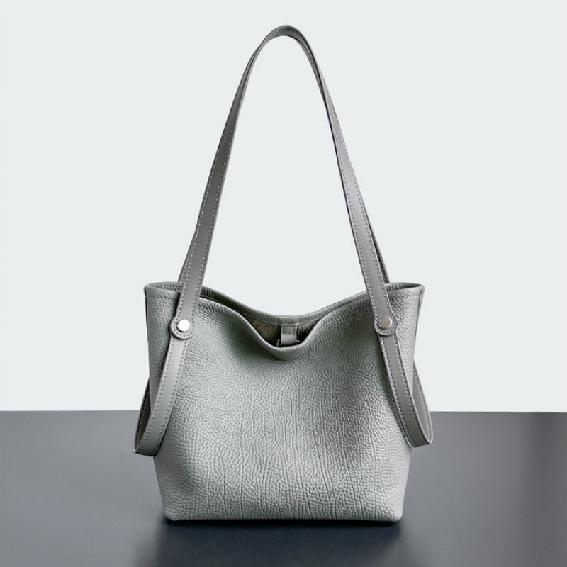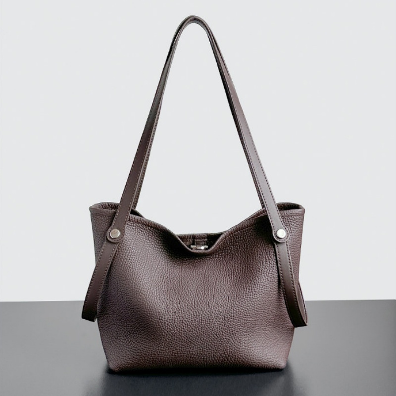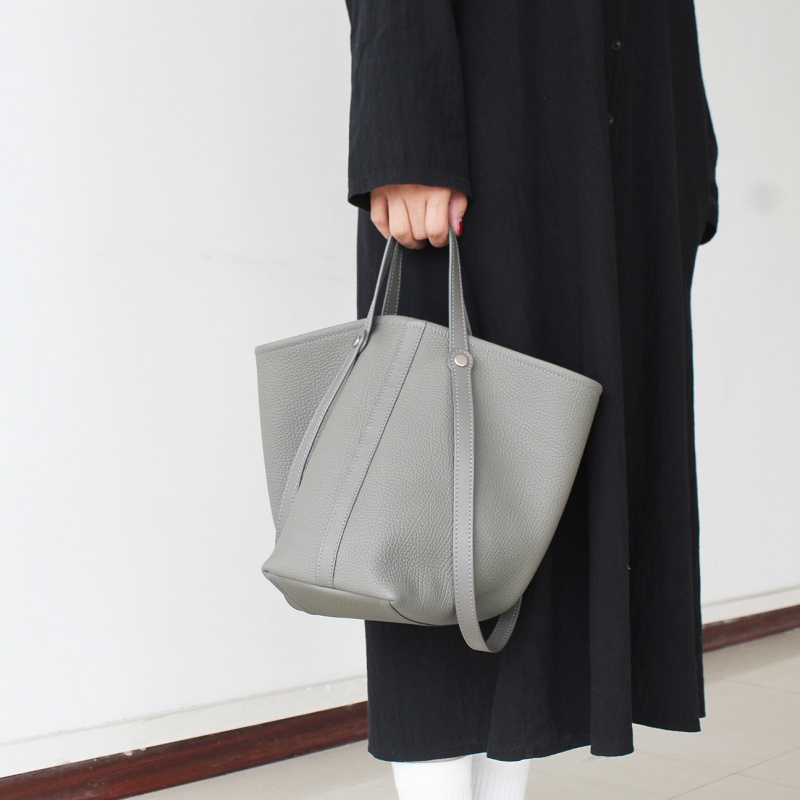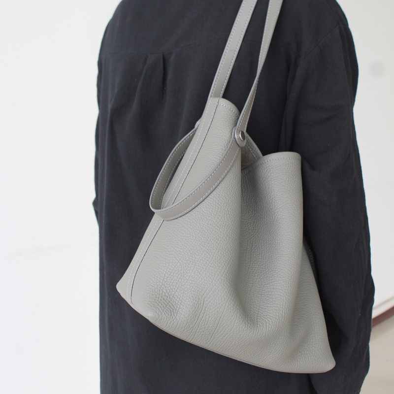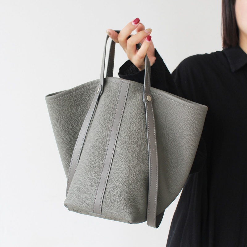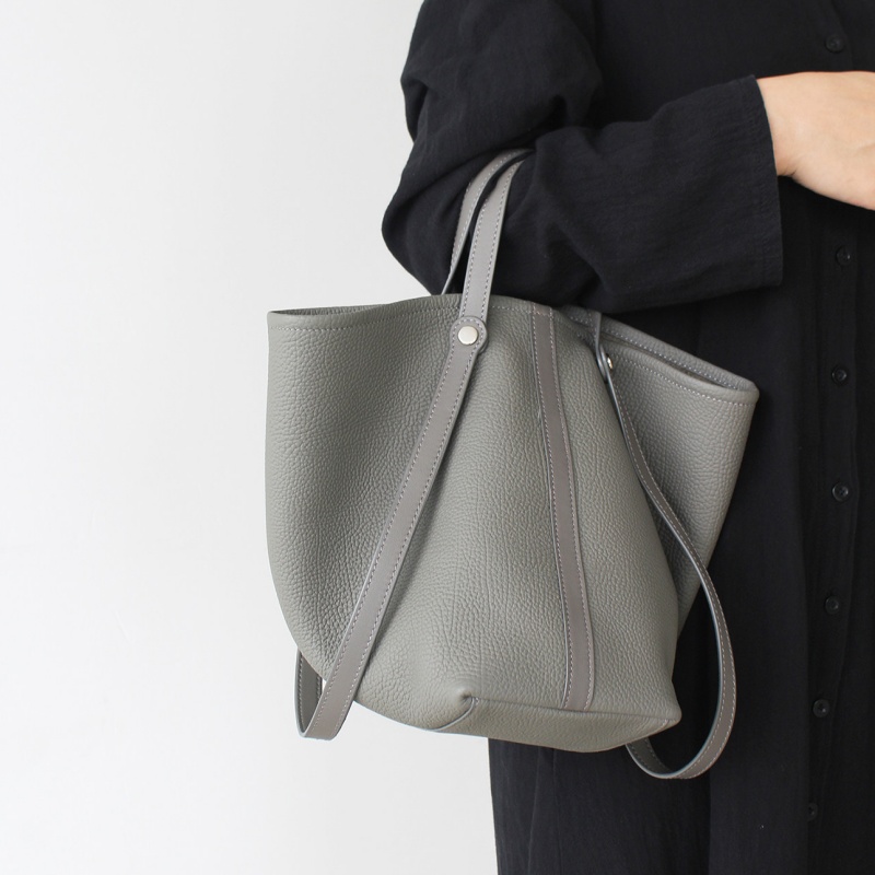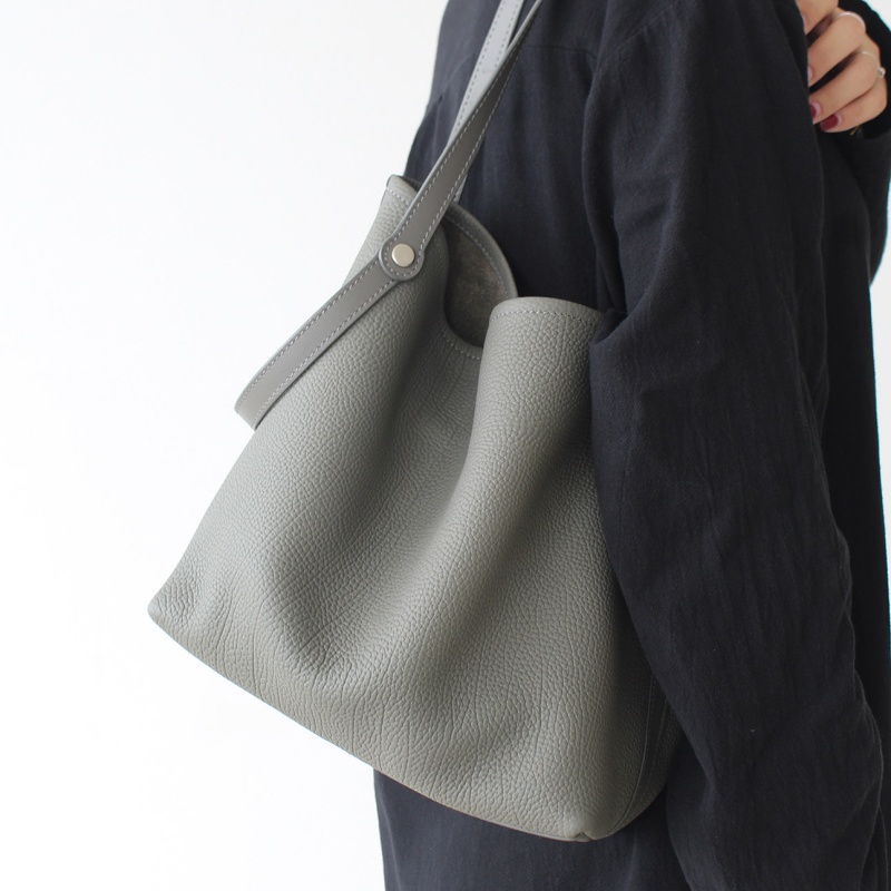 - ポイント:本革素材のバケツ型トート・ショルダーバッグ。台形のシルエットが特徴で、開口部が広くて収納性に優れています。シンプルなラインデザインが目立たず、「クワイエットラグジュアリー」なスタイルを表現。シボ加工された本革素材を使用することで、「ソフトだけど型崩れしにくい」「肌触りが良く日常で使いやすい」という特長がある。中には取り外し可能なポーチ付きで細かい荷物もまとめてしまえる。大きすぎず、日常使いのしやすいバッグです。