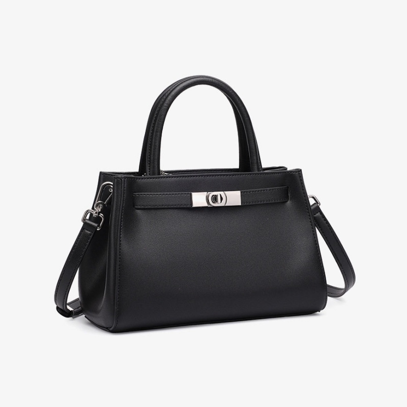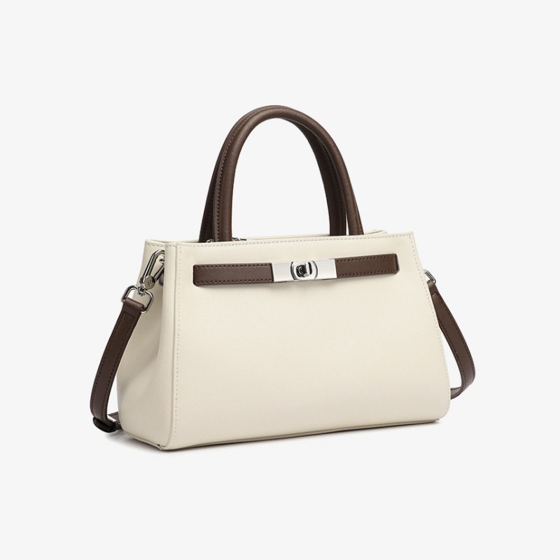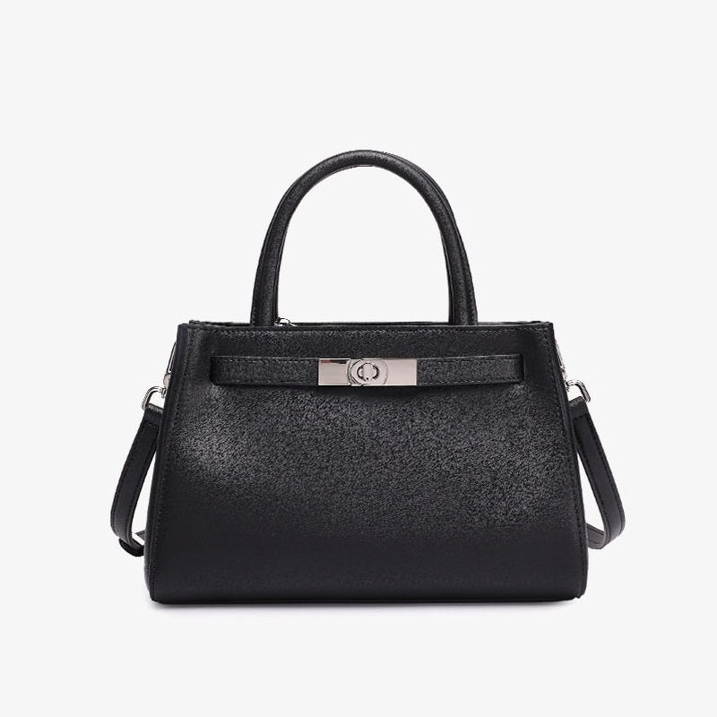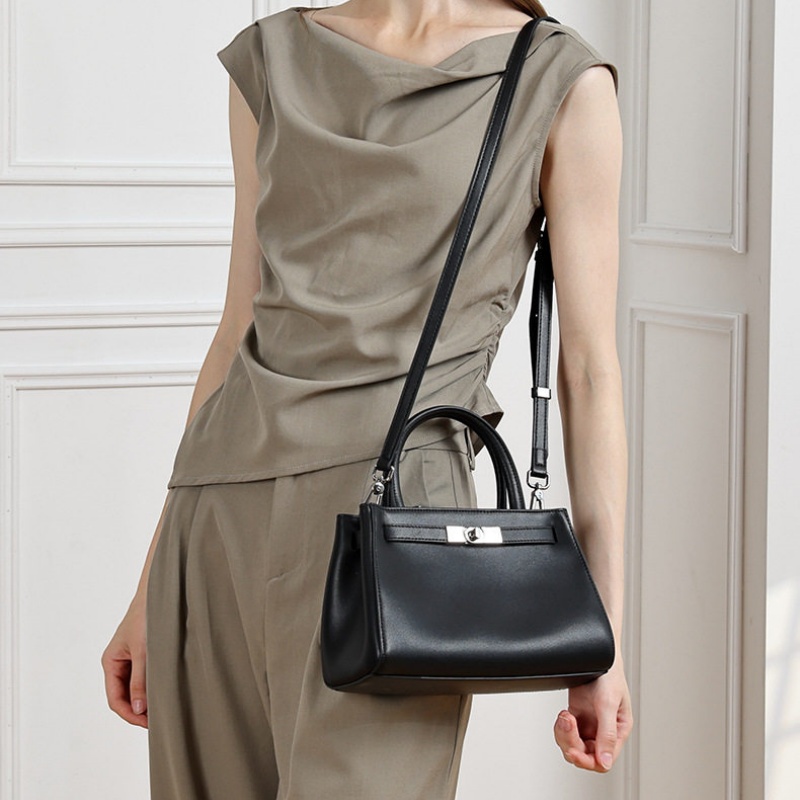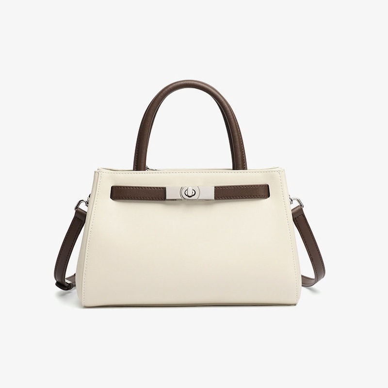 フロントを飾るシルバーのターンロックが、知的な輝きを添え、クリームホワイトのバイカラーデザインはコントラストが効いたモダンな印象を。シックなブラックは、どんなシーンにも溶け込む万能な一品です。取り外し・調節可能なショルダーストラップ付き、手持ちでエレガントに、肩掛けや斜めがけで軽やかに、その日のスタイルや気分に合わせて使い分けが可能です。