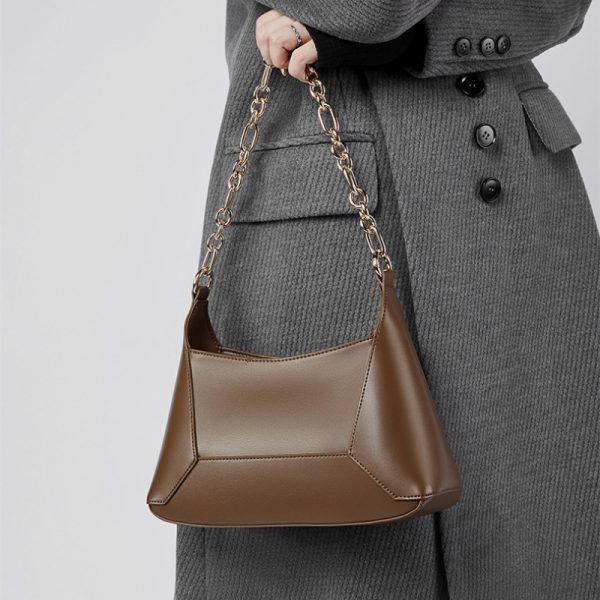 - ポイント:普段使いにちょうど良いサイズ感のショルダーバック!珍しいジオメトリ柄、デザイン性があり、他にはなかなか無いモードな空気が漂います。高級感のあるリアルレザー素材を使用耐用性に優れ、毎日使いたくなるアイテムです。チェーンストラップと短めベルト、長めベルトが3本付いており、自由に取り外しできるので、手持ち、肩掛け、斜め掛けもできるのも嬉しいポイントです。マチがあるので、見た目以上に収納力がある!コーディネートに馴染みやすいベーシックなカラー展開で、カジュアルはもちろんガーリーから韓国っぽいコーデまで幅広いマッチしてくれます。