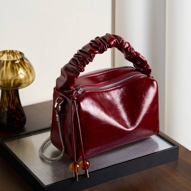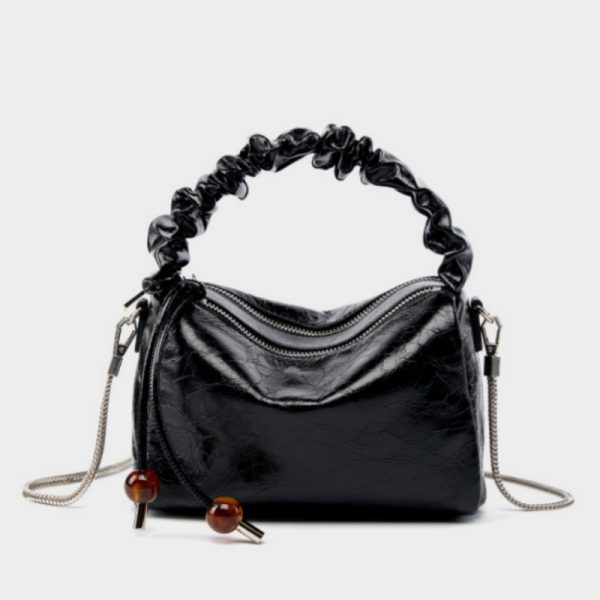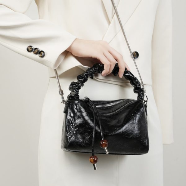 - ポイント:しわのあるトップレイヤ牛革素材のチェーンショルダーバッグ。ハンドル部分がシャーリング(ひだ状)になっているデザインは特徴、独特の質感とヴィンテージ感があり、ファッション性が高い。ハンドルのプリーツデザインが可愛らしさや個性を演出し、チェーンのショルダーストラップがあるので、ショルダーバッグとして使えるほか、ハンドバッグとしても持てます。コンパクトなサイズ感は小物を入れるのに最適!全体的に、大人っぽくてオシャレなデザインのバッグで、様々なスタイルに合わせやすいアイテムだと言えるでしょう。