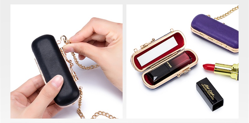 斜め掛けできるショルダーチェーン付きのリップケース。リップ一つ収納できます。鏡つけるので、ちょっとしたお化粧直しにも大変便利です。カラーは可愛い6色をご用意しました。見た目もおしゃれでアクセサリー感覚でお使いいただけます。