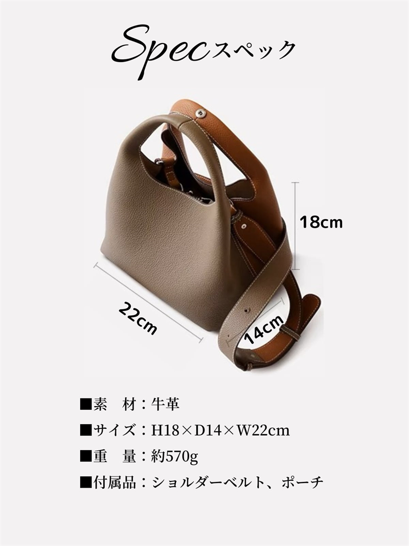 - ポイント:上質な牛革を使用したショルダーバッグ。取り外しできる太めベルトとミニポーチが付いており、多様な掛け方が実現できるし、細かいものまできちんと収納可能。ミニマルなサイズでありながらも、マチが広いため収納力が高く、使いやすさを追求する方々におすすめです。シンプルなデザインも洗練された雰囲気を演出し、様々なシーンに適用できます。